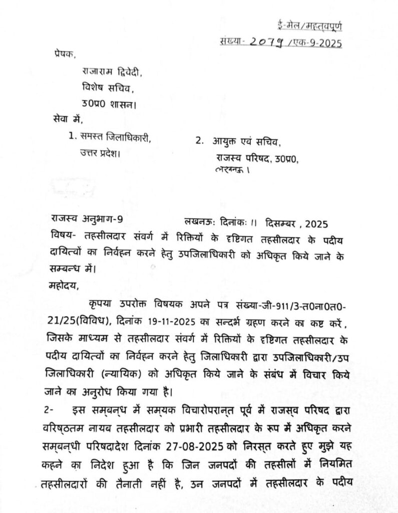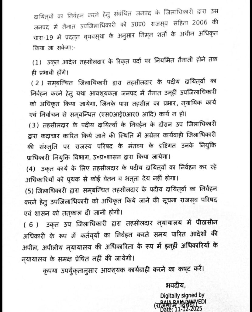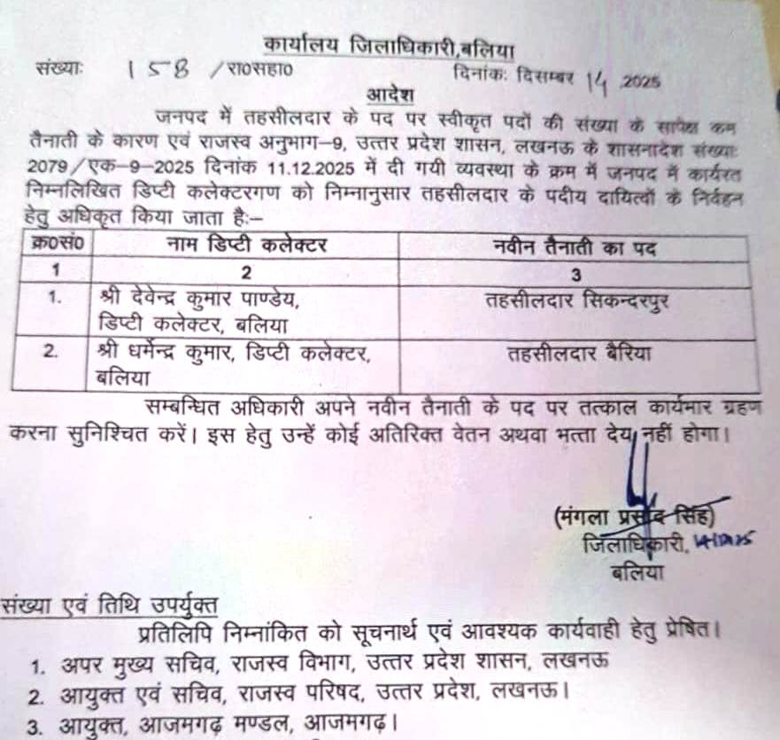 गौरतलब है कि उत्तर प्रदेश शासन द्वारा हाल ही में जारी पत्र संख्या 2079/एक-9-2025 (दिनांक 11 दिसम्बर 2025) के माध्यम से जिलाधिकारियों को यह अधिकार दे दिया गया है कि वे तहसीलदार संवर्ग में रिक्तियों के दृष्टिगत उपजिलाधिकारी/उपजिलाधिकारी (न्यायिक) को तहसीलदार के पदीय दायित्व सौंप सकें. और इसी आदेश के क्रम में जिलाधिकारी बलिया द्वारा दो पीसीएस अफसरों को तहसीलदार के पद पर तैनात कर दिया गया.